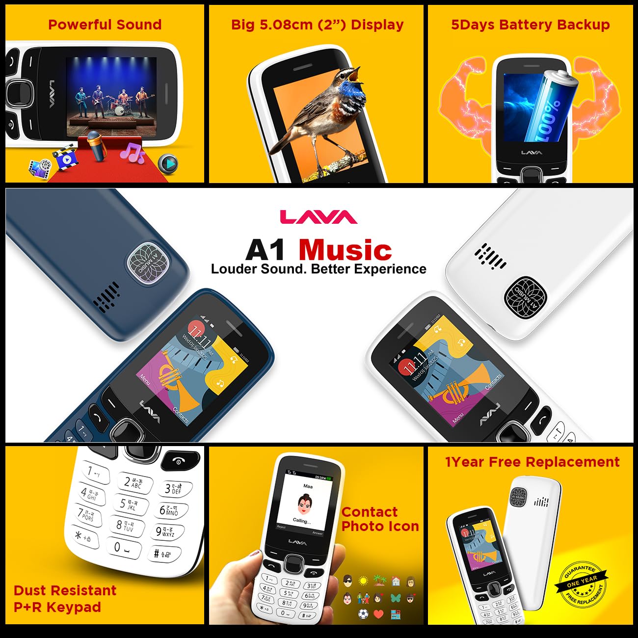 Lava announces Lava A1 Music new Version of our bestselling Lava A1 with premium looks & design. Clearest sound in the industry with big speakers. Furthermore it has 800 mah battery with 4 days long battery backup. Special Features: instant torch, Auto Call Recording, 22 Indian language support and super battery mode. Also providing of the best Service ” 1 YEAR REPLACEMENT Warranty “