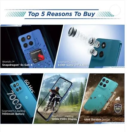 moto g57 power 5G is built for users who want a big battery, smooth display and clean software in one dependable phone. The Snapdragon 6s Gen 4 4 nm processor, paired with 8 GB LPDDR4X RAM and 128 GB UFS 2.2 storage, delivers responsive performance for social apps, browsing, work and casual gaming, while RAM Boost lets you extend memory virtually when you multitask heavily. The 6.72 inch FHD plus LCD with 120 Hz refresh rate keeps scrolling and animations fluid, and high brightness helps the screen stay readable outdoors. A 50 MP Sony LYT 600 main camera and 8 MP ultra wide camera cover detailed shots and wider scenes, supported by moto ai features and Google Photos tools on selected markets to refine portraits and low light photos. An 8 MP front camera with up to 2K video is ready for clear video calls and social content. A large 7000 mAh silicon carbon battery is the highlight, designed to last long days of streaming, calling and navigation, backed by 30 W TurboPower fast charging so you can get back to high battery levels faster. The phone adds a Pantone inspired vegan leather back for a comfortable grip, IP64 dust and splash resistance and MIL STD 810H testing for extra reassurance. Running Android 16 with a promised upgrade to Android 17 and three years of security updates, moto g57 power 5G aims to stay secure and smooth over the long term for everyday Indian 5G use.