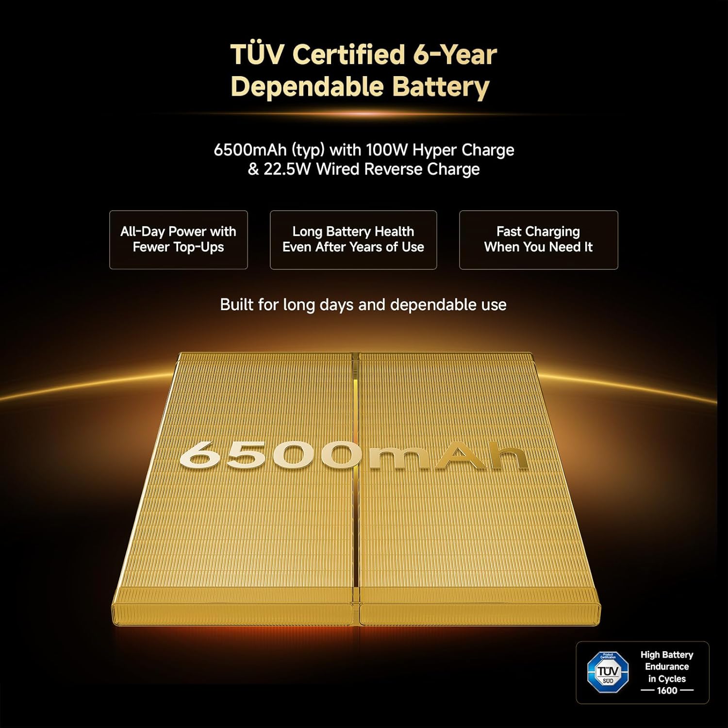 Silicon carbon 6500mAh battery with 100W Hypercharge and 22.5W reverse charging having advanced 1600 lifecycles