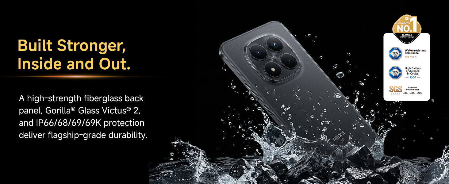 Fibre glass back panel with Corning Gorilla Glass Victus 2 to survive rough drops and highest waterproofing (IP69K) along with AI Wet Touch 2.0